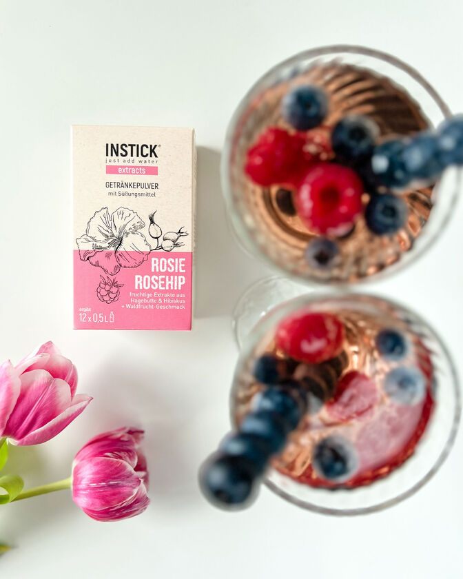 Einfach den Inhalt eines INSTICK Extracts Rosie Rosehip mit 0,5 Liter heißem oder kaltem Wasser anrühren und fertig ist das zuckerfreie Lieblingsgetränk. Je nach Geschmack